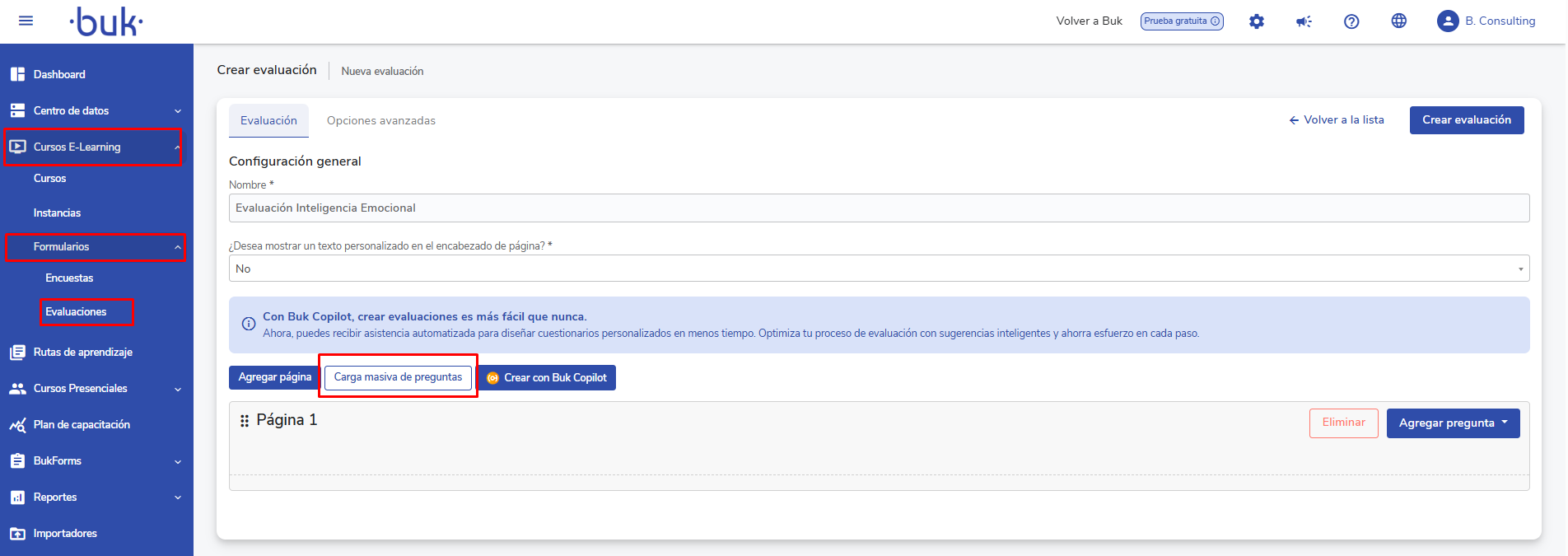 Este artículo está diseñado para guiar a usuarios con rol de Administrador o Superadministrador en la creación de evaluaciones dentro del módulo de cursos e-learning en Buk, y en particular para explicar cómo utilizar la carga masiva de preguntas desde un archivo Excel
