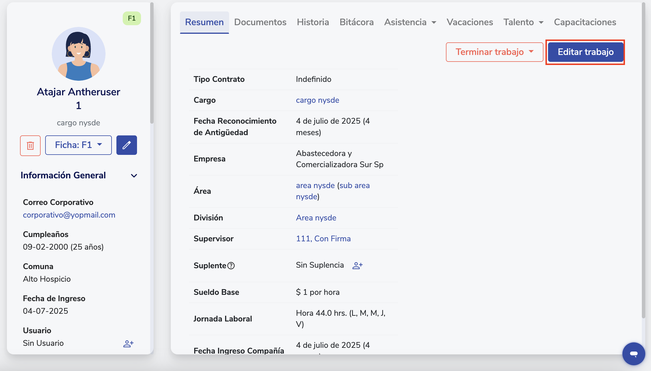 Para editar el trabajo de un empleado debes entrar a la ficha del empleado y seleccionar el botón "Editar trabajo".