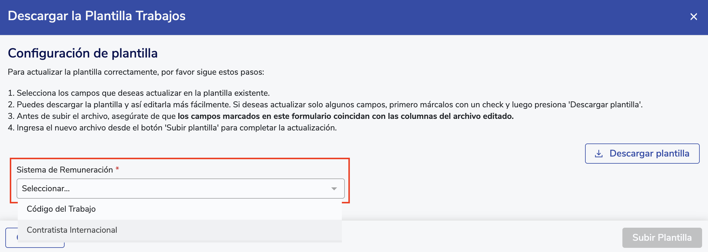 Una vez seleccionado el sistema de remuneración, se te desplegara una lista con los campos a seleccionar, donde deberás elegir aquellos que necesites editar. Luego, puedes descargar el template con el botón "Descargar plantilla" para realizar todos los cambios que necesites en el excel y luego subirlo con el botón subir plantilla.