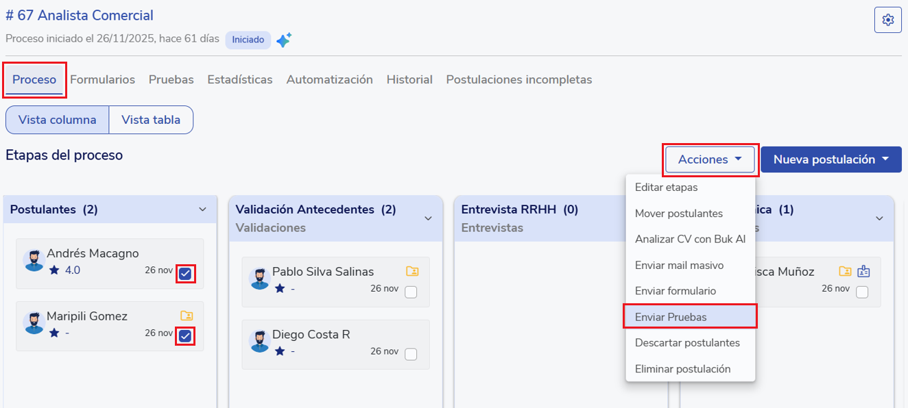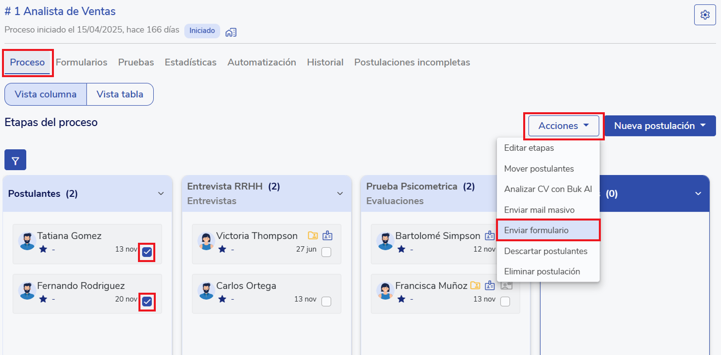 Dentro de la pestaña de tu proceso, selecciona a todos los candidatos que desees evaluar marcando la casilla junto a sus nombres o seleccionando toda una etapa. Luego, haz clic en el botón Acciones y selecciona Enviar formulario. Se abrirá una ventana para que elijas la fuente y la prueba específica; una vez seleccionada, el envío se realizará automáticamente a todo el grupo.
