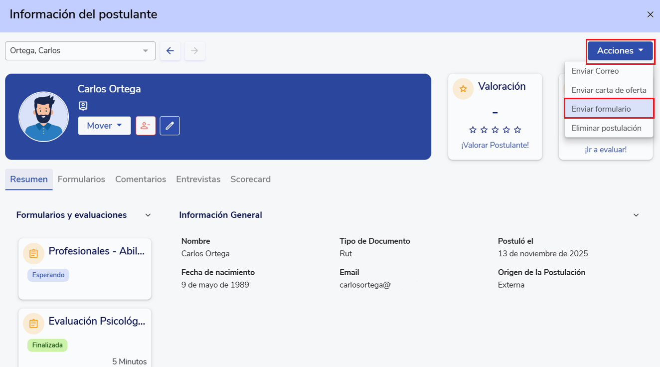 Si necesitas enviar una prueba a una persona en particular, entra en su ficha personal. Allí, haz clic en el botón Acciones y elige Enviar formulario. Al igual que en el método anterior, deberás seleccionar la fuente y la prueba para que el sistema le envíe el acceso de inmediato.