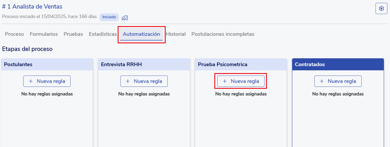Para optimizar tu tiempo, puedes configurar el envío automático de pruebas cuando un candidato alcance una etapa específica. Para hacerlo, primero ingresa a la pestaña Automatización de tu proceso, ubica la etapa donde deseas que ocurra el envío y haz clic en + Nueva regla.