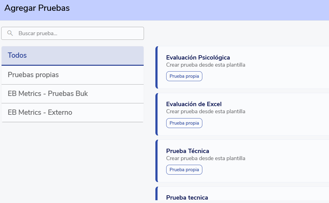 Pruebas propias: Son las plantillas que tú o tu equipo han diseñado previamente en la sección de plantillas del módulo de selección.