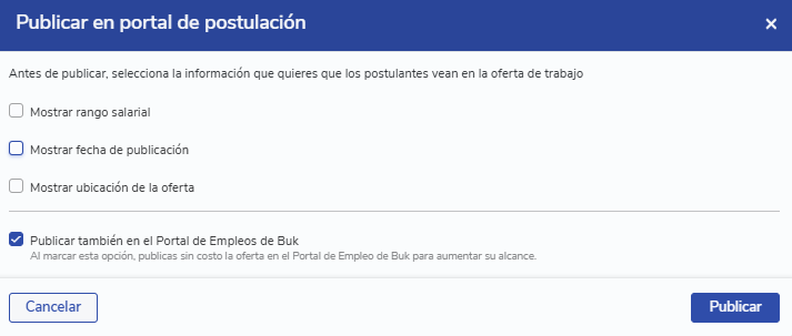 Al publicar en Portal de Postulación (Trabaja con Nosotros) podrás publicar también en el Portal de Empleos de Buk.