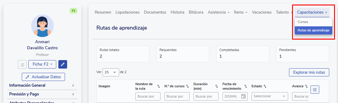 - La información que se muestra en Mi Ficha se sincroniza con las rutas configuradas en el LMS.