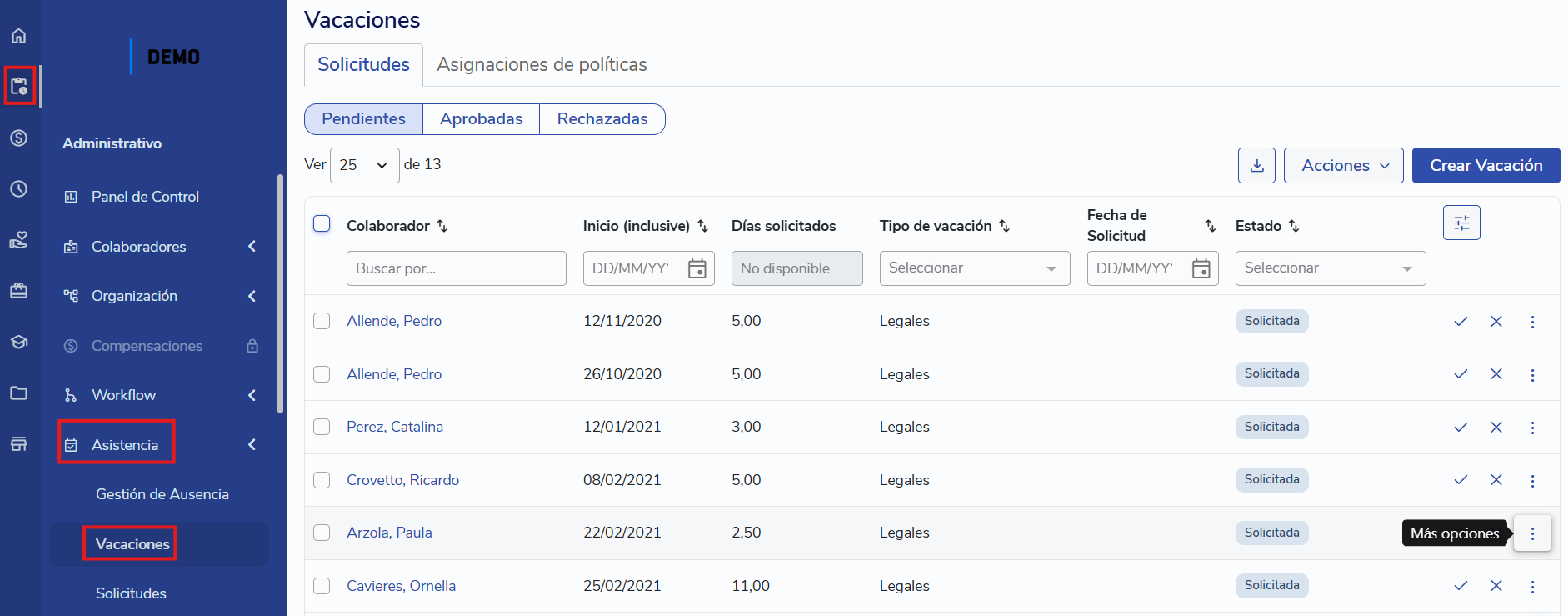 Con el botón "Acciones" podrás ejecutar los procesos masivos de aprobar, rechazar o eliminar vacaciones.