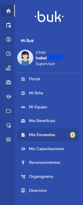 Si eres colaborador y deseas responder una encuesta, accede al símbolo de la casa llamado 'Mi Buk' y dentro de este a la parte del menú lateral que dice 'Mis Encuestas'. Allí verás las encuestas activas que tienes asignadas. Haz clic en la encuesta correspondiente para comenzar a responderla.