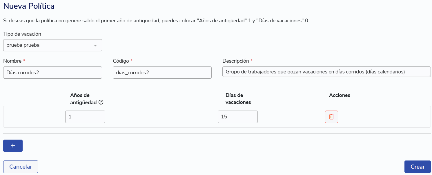 Esta pantalla te permite ver todas las políticas de vacaciones existente junto con las opciones de crear nuevas, editar o eliminar alguna política de vacaciones.