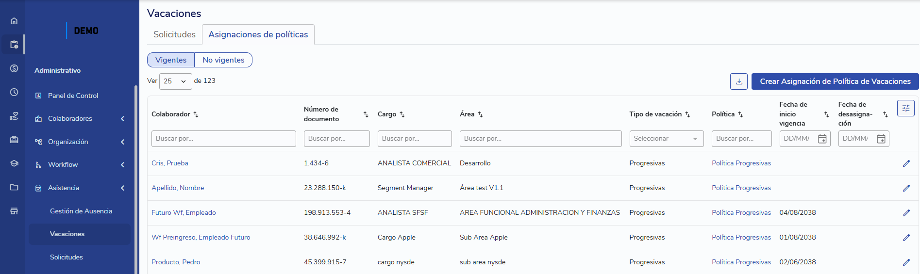 Contamos con una tabla que muestra las políticas de vacaciones asignadas ordenada por colaborador.