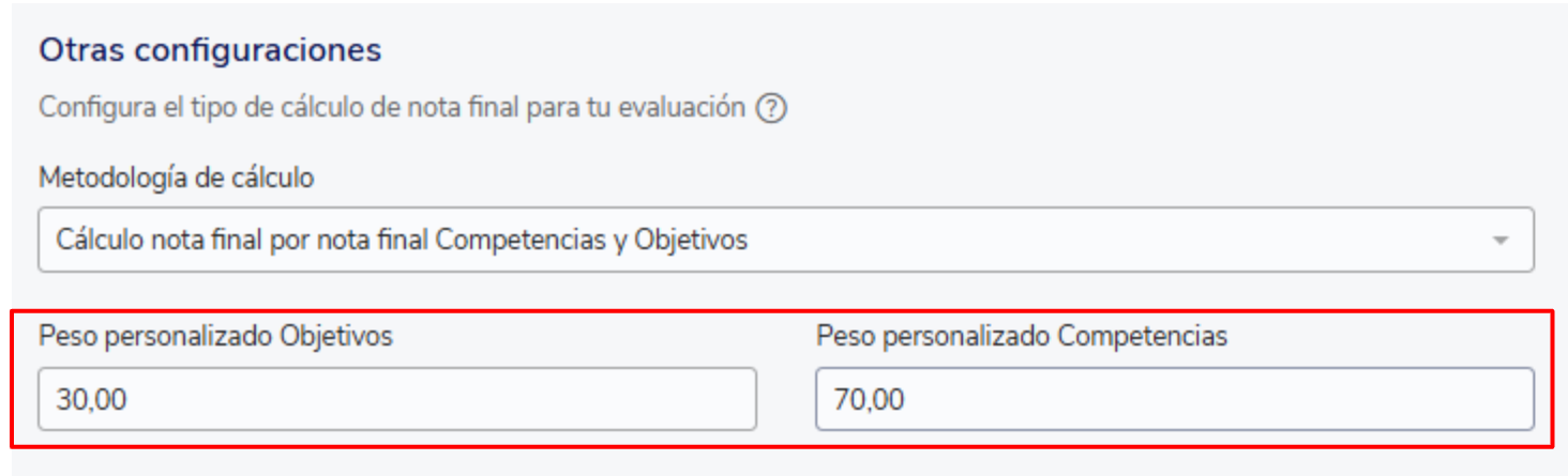 Nota final objetivos= Nota objetivos autoevaluación* ponderador autoevaluación+ Nota objetivos evaluación descendente * ponderador descendente +Nota objetivos evaluación ascendente * ponderador ascendente + Nota objetivos evaluación paralela* ponderado paralela