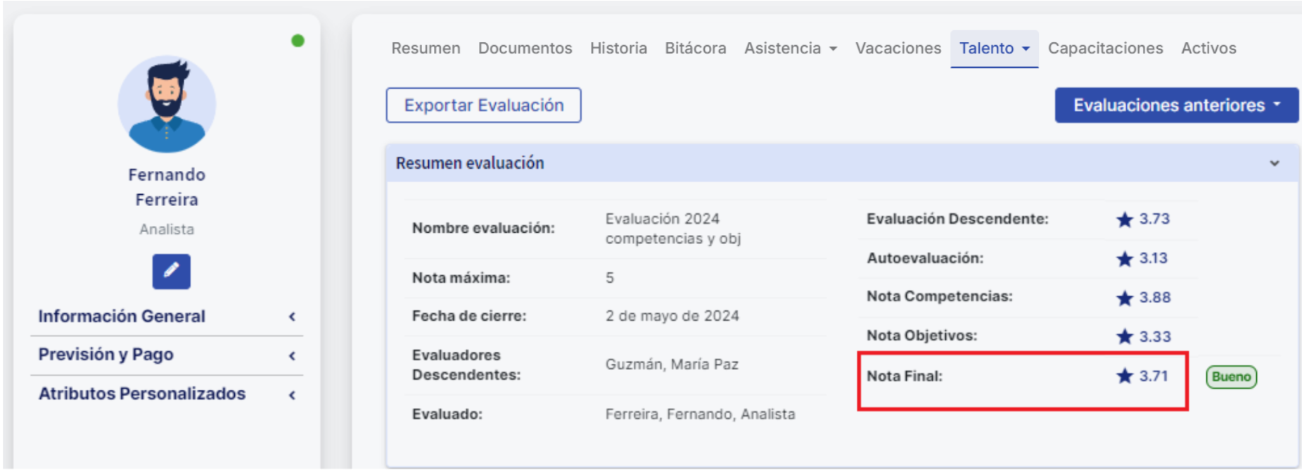 Seguindo com o exemplo, esta avaliação era composta por Autoevaluación e evaluación descendente, e a configuração de pesos era 30% e 70% respectivamente. A nota geral de objetivos na avaliação descendente foi 3.78 e 2.31 na autoavaliação