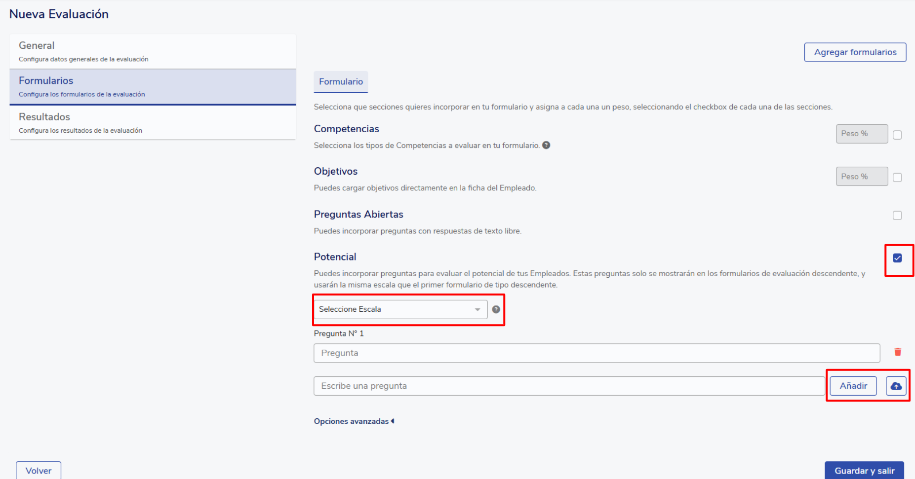 Nas avaliações de desempenho, você pode configurar os formulários para incluir perguntas do tipo potencial, o que é indispensável para gerar automaticamente a matriz Nine-box nos relatórios de avaliação. Portanto, se você não incluir esse tipo de perguntas (ou se as eliminar de um processo já criado), o Ninebox não será gerado ou deixará de estar disponível.
