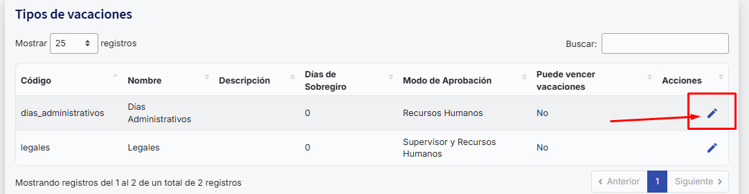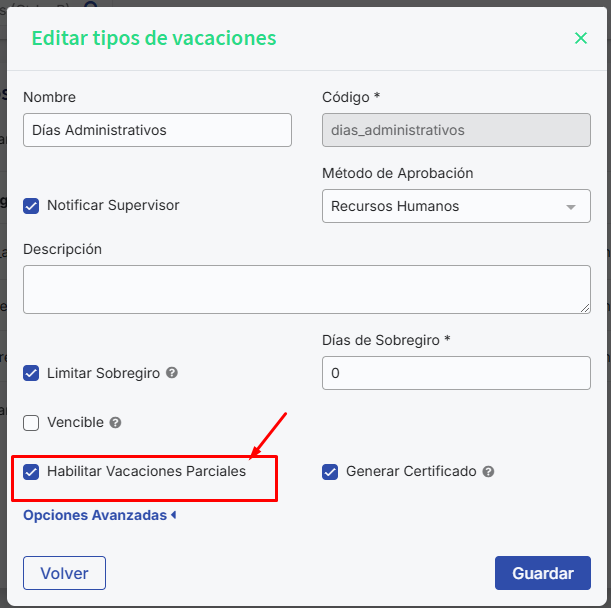 Posteriormente você deve ir à barra superior direita engrenagem, Administração>>Tipos de férias onde encontrará a opção “dias_administrativos”, a qual poderá editar e configurar marcando o checkbox “Habilitar férias parciais”, esta opção é muito importante pois permitirá conceder via benefícios dias completos, meios dias ou somar dias ao saldo.