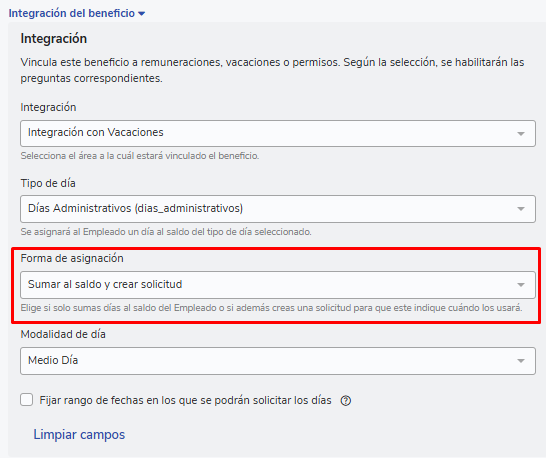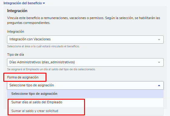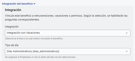 Uma vez completadas as configurações prévias, você pode proceder a criar o benefício seguindo o fluxo habitual Como criar um benefício? : Buk Colombia, ao chegar na opção “Integração” encontrará 2 opções:
