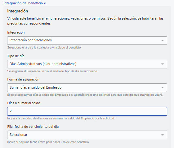 1.- O administrador configura o benefício com a opção “Somar dias ao saldo do colaborador” (Serão somados a quantidade de dias configurados ao saldo de Dias Administrativos)