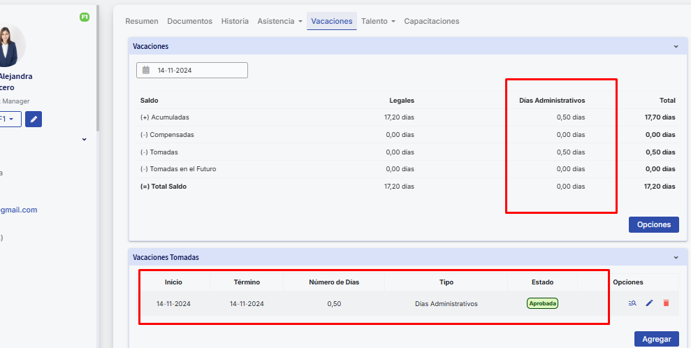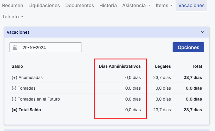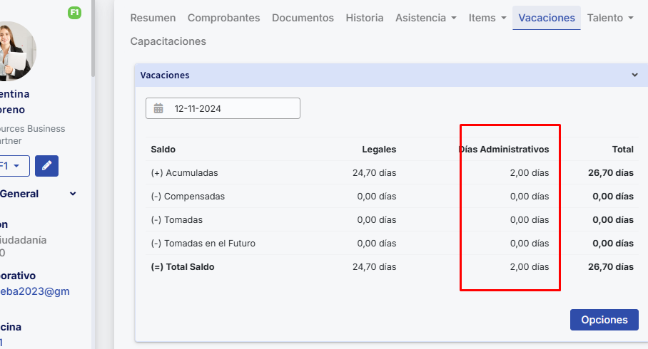 Nota: “Dias Administrativos” que é gerado ao ativar a configuração geral, mas sem saldo de dias, você poderá visualizar da seguinte forma na ficha dos seus colaboradores: Dias administrativos : Buk Colombia