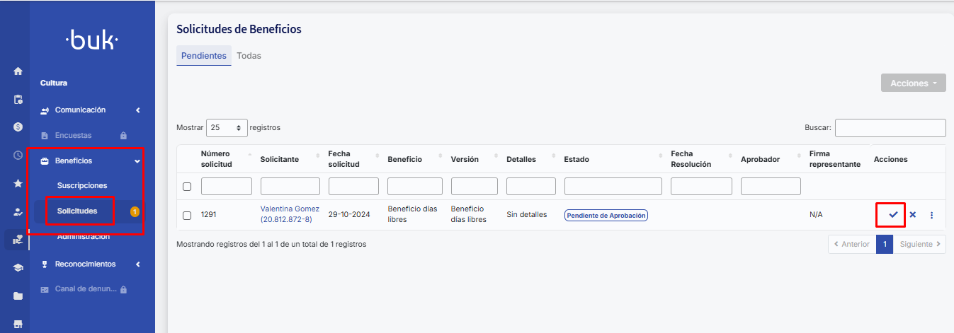 3.- O administrador ou chefia aprova o benefício Fluxo aprovação benefícios (lembre-se que também conta com a opção de ativar o módulo de Módulo de Tarefas Pendentes : Buk Colombia para poder aprovar por este meio)