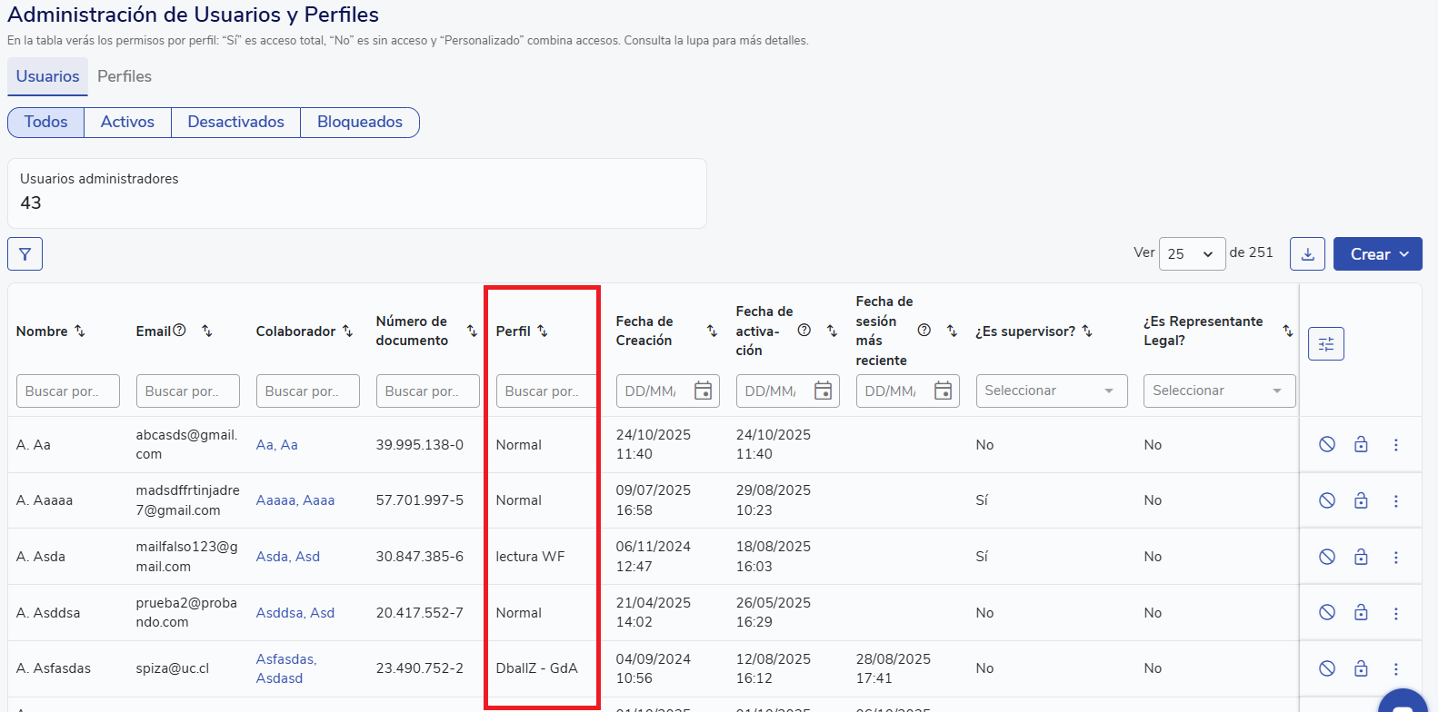 - Clique no botãoCrear Perfilde Usuario para gerar um novo, ou selecione o ícone de lápis para editar um existente.
