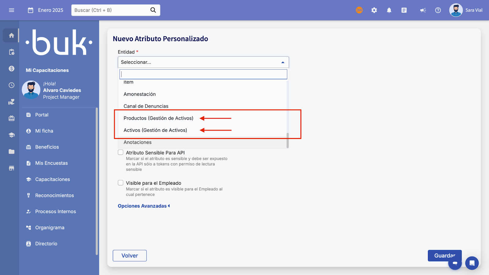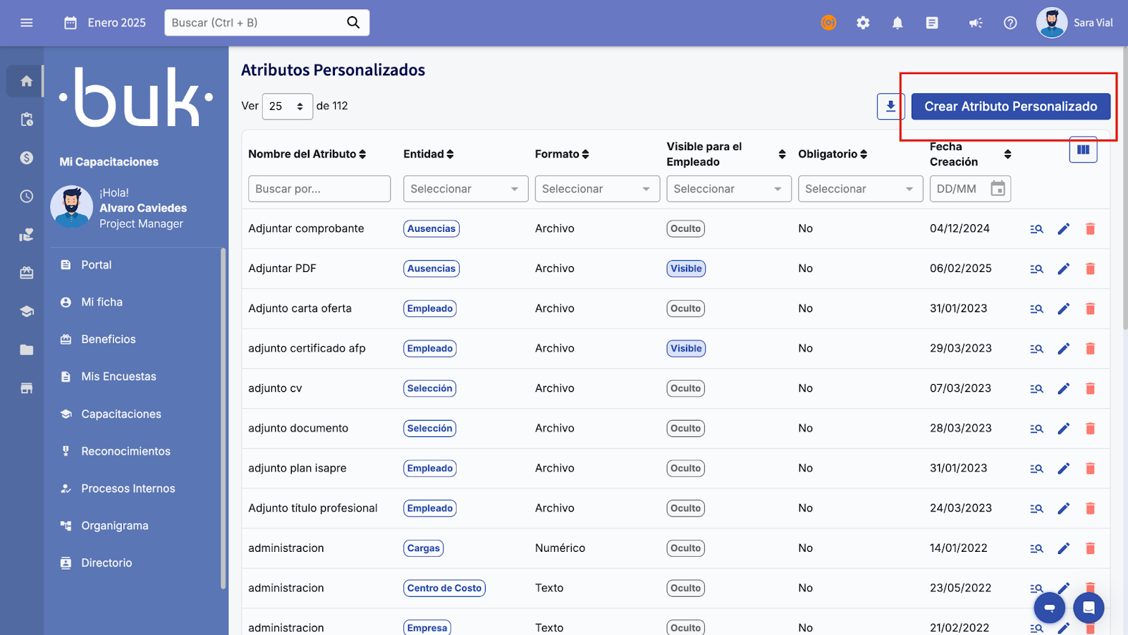 Ao criar um atributo personalizado do tipo data, é possível configurar o número de dias de antecedência com o qual deseja ser notificado. A plataforma gera automaticamente um alerta que aparece na seção de "Tarefas pendientes" do usuário, garantindo que não sejam ignoradas datas críticas.