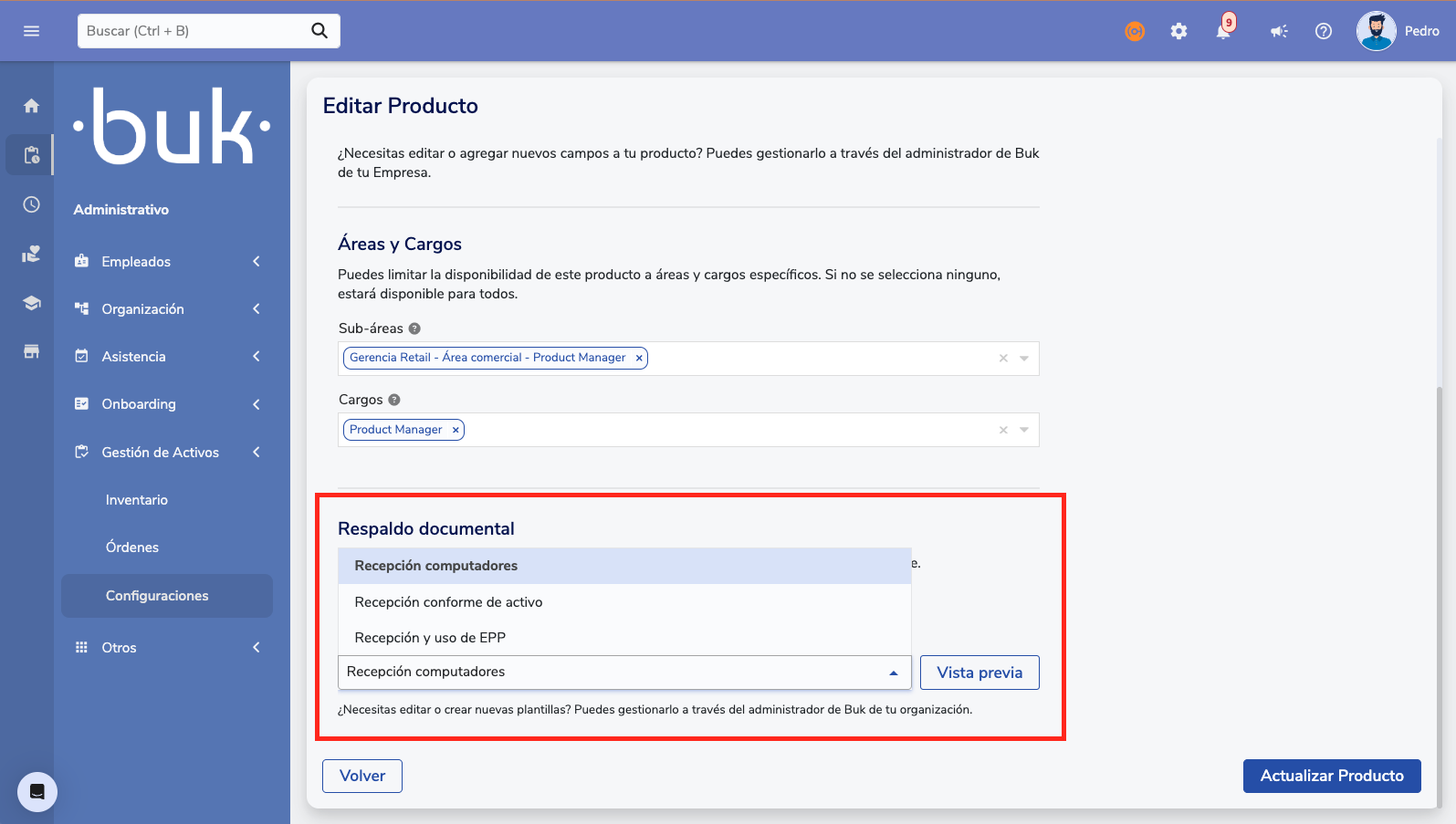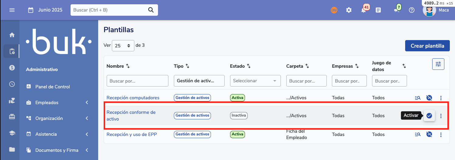 A integração entre Gestión de Activos e Gestión Documental no Buk permite automatizar a geração de documentos (Recepción conforme, cláusulas de uso) ao asignar un activo a un colaborador. Este guia explica como configurá-lo, tanto para clientes sem Gestión Documental quanto para aqueles que já a usam.