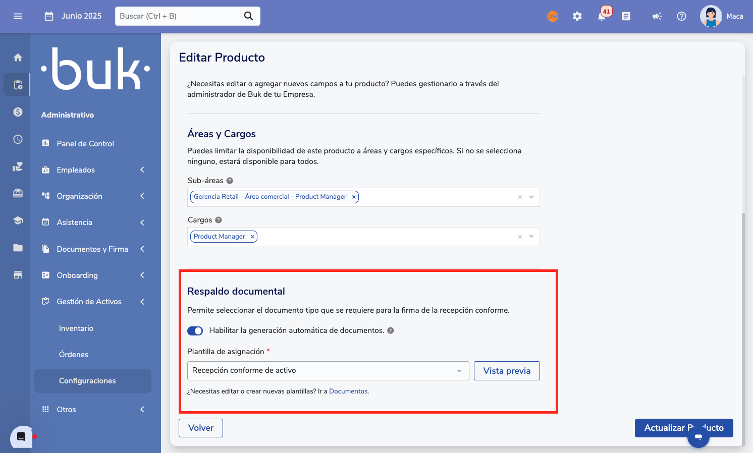 - Dentro de cada Producto,habilitea geração automática de documentos y luegoselecionea plantilla para que se genere automáticamente al asignar ese activo.