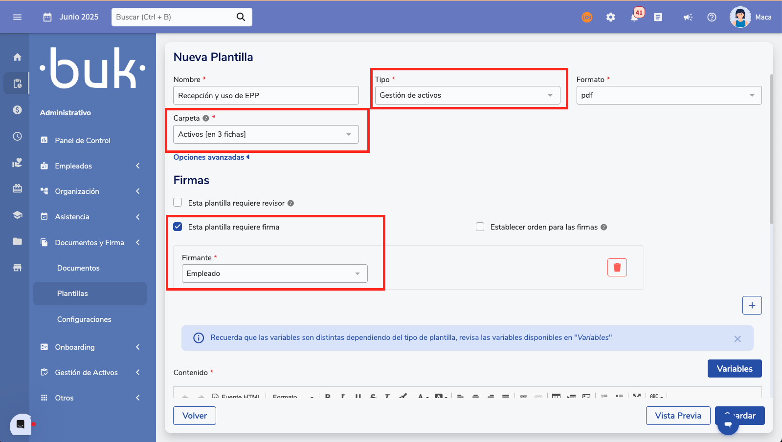- Escolha o tipo "Gestión de Activos" e desenhe o documento (texto, campos variáveis, firmas).