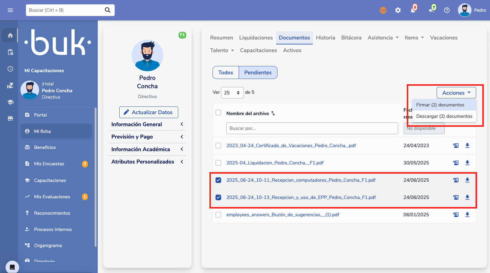 - Passo 3:O colaborador pode acessá-lo em sua ficha (Documentos > Carpeta "Activos") e assinar de maneira individual ou em massa.