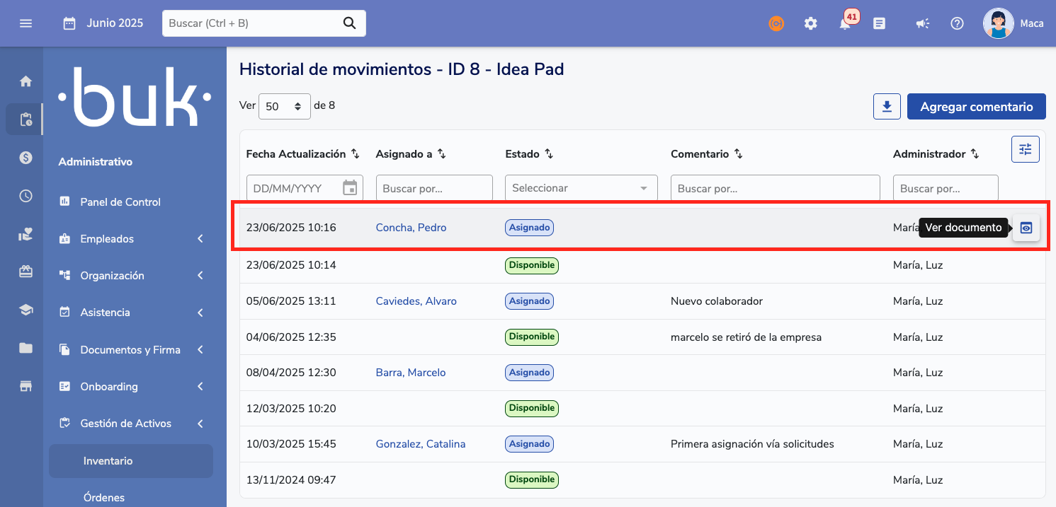 - Passo 4: O administrador de Gestão de Ativos poderá ver o documento gerado no Histórico de movimentações de cada ativo.