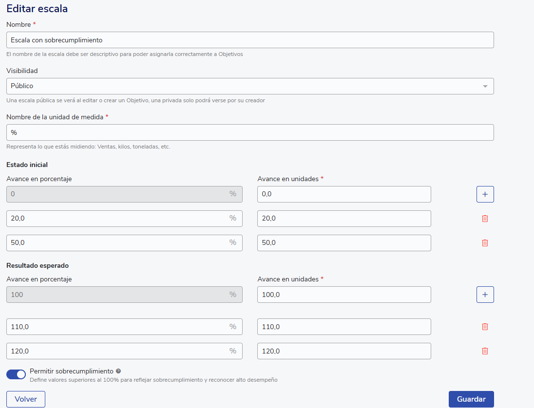 - Caso a escala de avanço de objetivos tenha sido configurada com sobrecumprimento, todos os valores configurados acima de 100% de avanço serão estabelecidos como resultados esperados e, portanto, serão todos equivalentes à nota máxima da escala de resultados.