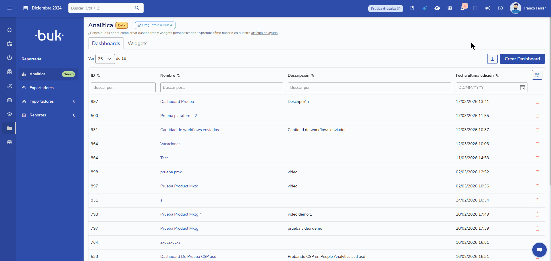 Dentro do módulo de Analítica, vá até a abaDashboardse clique no nome do dashboard que deseja editar.