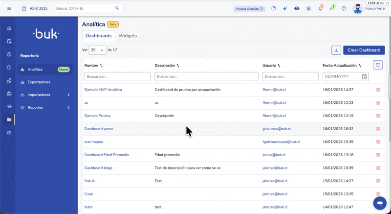 - AcesseReportes → Analítica → Dashboard, e localize o dashboard que deseja eliminar utilizando os buscadores da tabela.