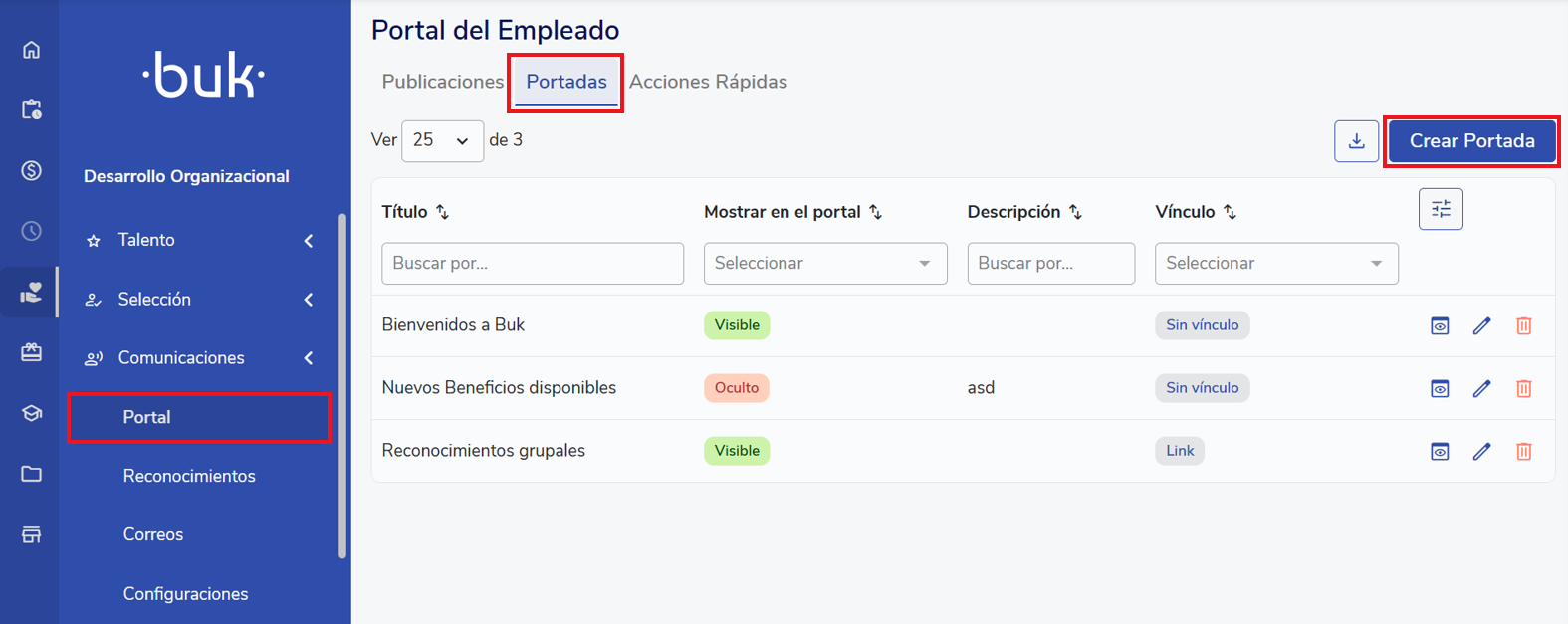 As capas são configuradas en Desarrollo Organizacional > Comunicaciones > Portal, na seçãoCapas. Aquí está a lista de todas as capas, que estão visíveis ou ocultas, as quais podem ser editadas ou excluídas. Nesta visualização também é possível criar novas capas.